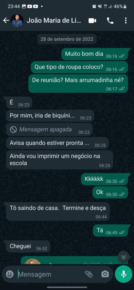 Nas mensagens, que fazem parte da investigação, a servidora pergunta qual o tipo de roupa que deveria vestir para um evento em que iria acompanhada pelo então diretor da Escola. “Por mim, iria de biquini”, disse. Em outra, o professor disse que iria viajar e questionou se não daria “um cheiro e um abraço” antes da viagem.